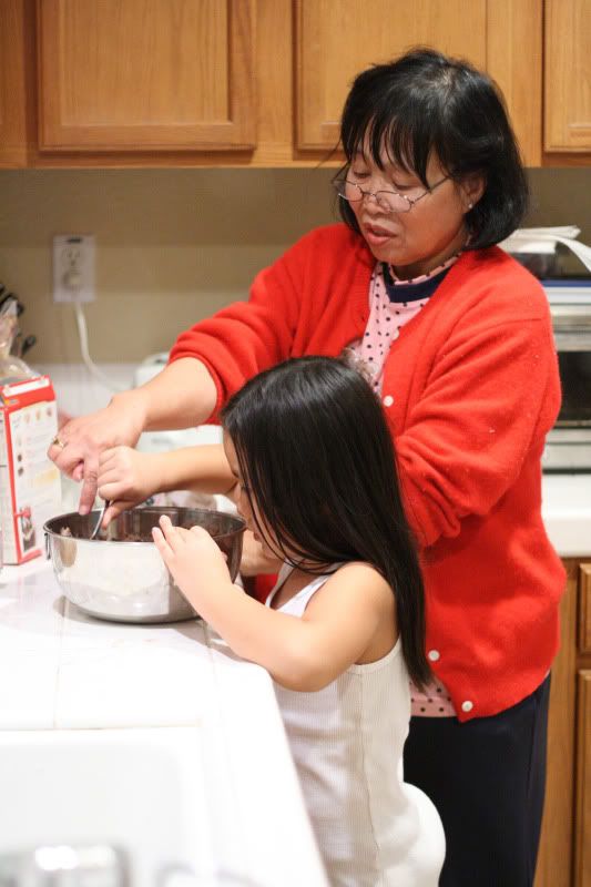 Kaia and my mom baking brownies.