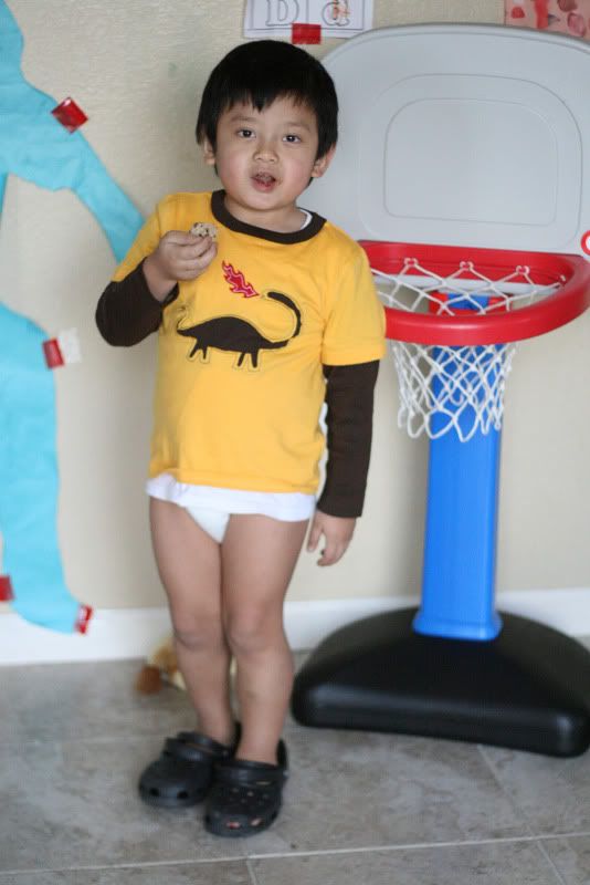 Aaron ran away to the next-door-neighbors and made it upstairs in their house wearing exactly what you see here - shirt, no pants and my mom's Crocs.