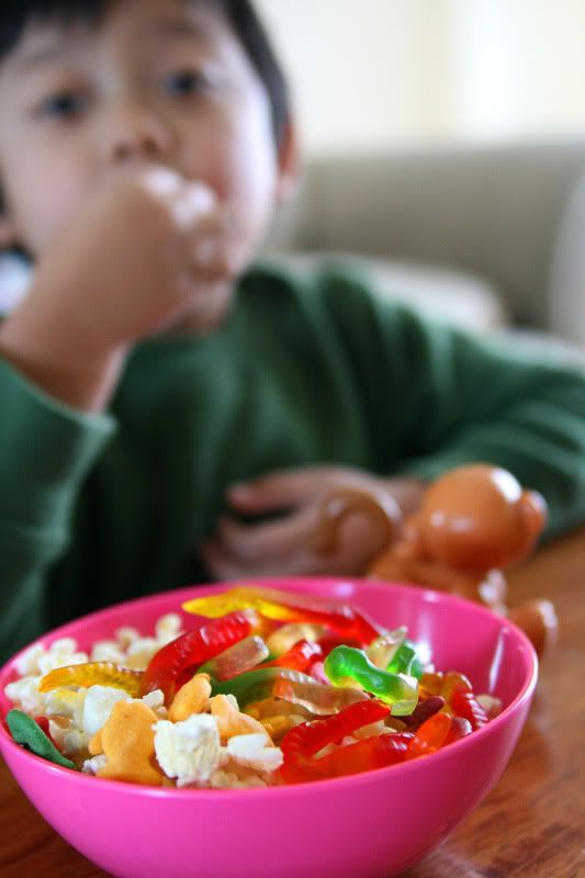 I gave the boy a bowl of popcorn. I returned later to find that he added goldfish crackers and gummi worms. He said he was eating grubs.