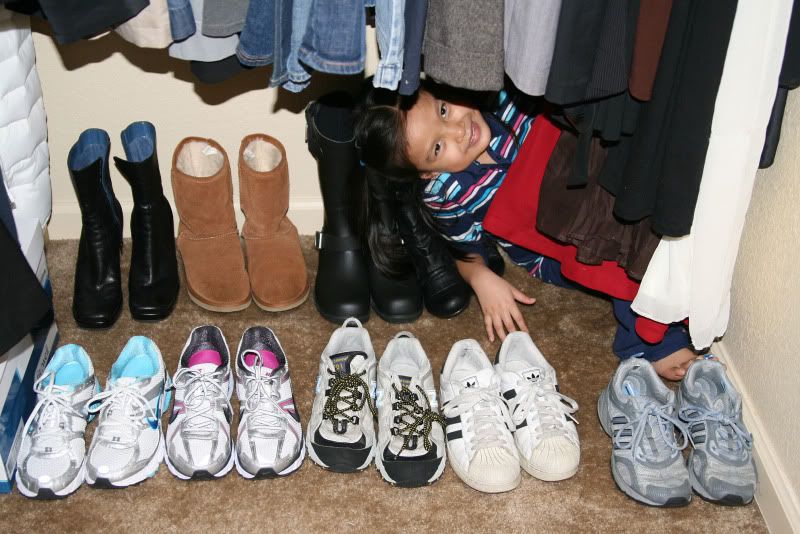 Kaia likes to play in my closet. She said my clothes and shoes were "camouflaging" her and that I couldn't see her. Yeah, I'll show you, Miss Big Words. I can see you! You're wrong!