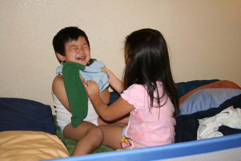 Sometimes I tell my 5 year old to help my 4 year old get his pj's on. It cracks me up every time.
